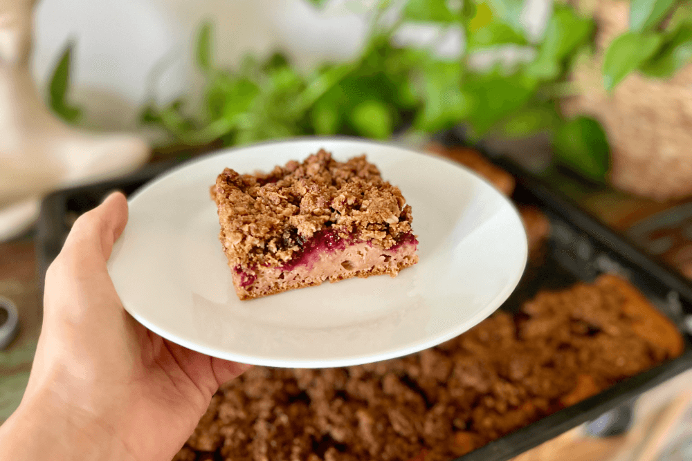 Zásoby jogurtu a plný mrazák malin z léta? To znamená jediné! Postupujte podle následujícího receptu a upečte si snadný, rychlý a chuťově lehký malinový koláč z jogurtového těsta s křupavou celozrnnou drobenkou.