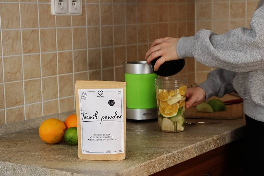 Pro zmírnění výrazné chuti můžete tocosh v prášku přidat do smoothie.
