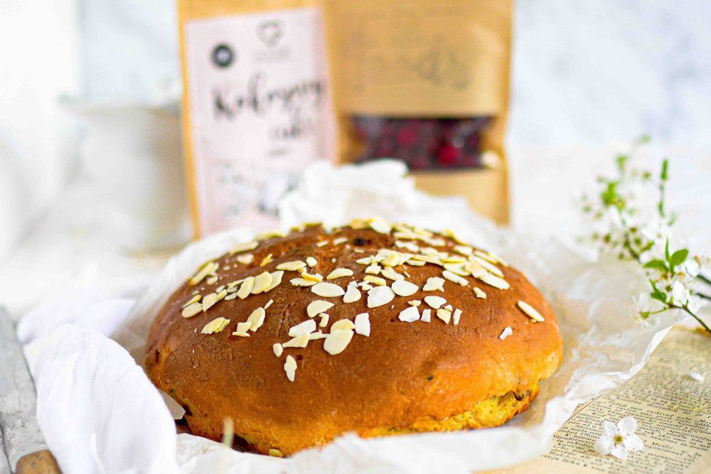 Zatím si do větší misky prosejeme polohrubou a hladkou mouku, přidáme vanilkový, krystalový cukr, citrónovou kůru, máslo, špetku soli. Když máme kvásek připravený přidáme ho do mísy a uhněteme na hladké, nelepivé těsto. Do těsta postupně přidáváme plátky mandlí, rozinky a brusinky (pořádně okapané od rumu).