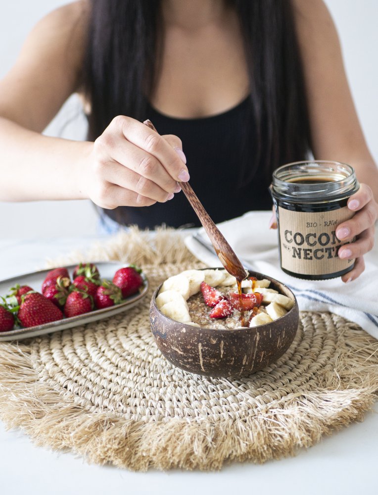 BIO Kokosový nektar můžete použít všude tam, kde běžně saháte po cukru: do čaje, kávy, smoothies, snídaňových kaší, jogurtů nebo domácích dezertů.